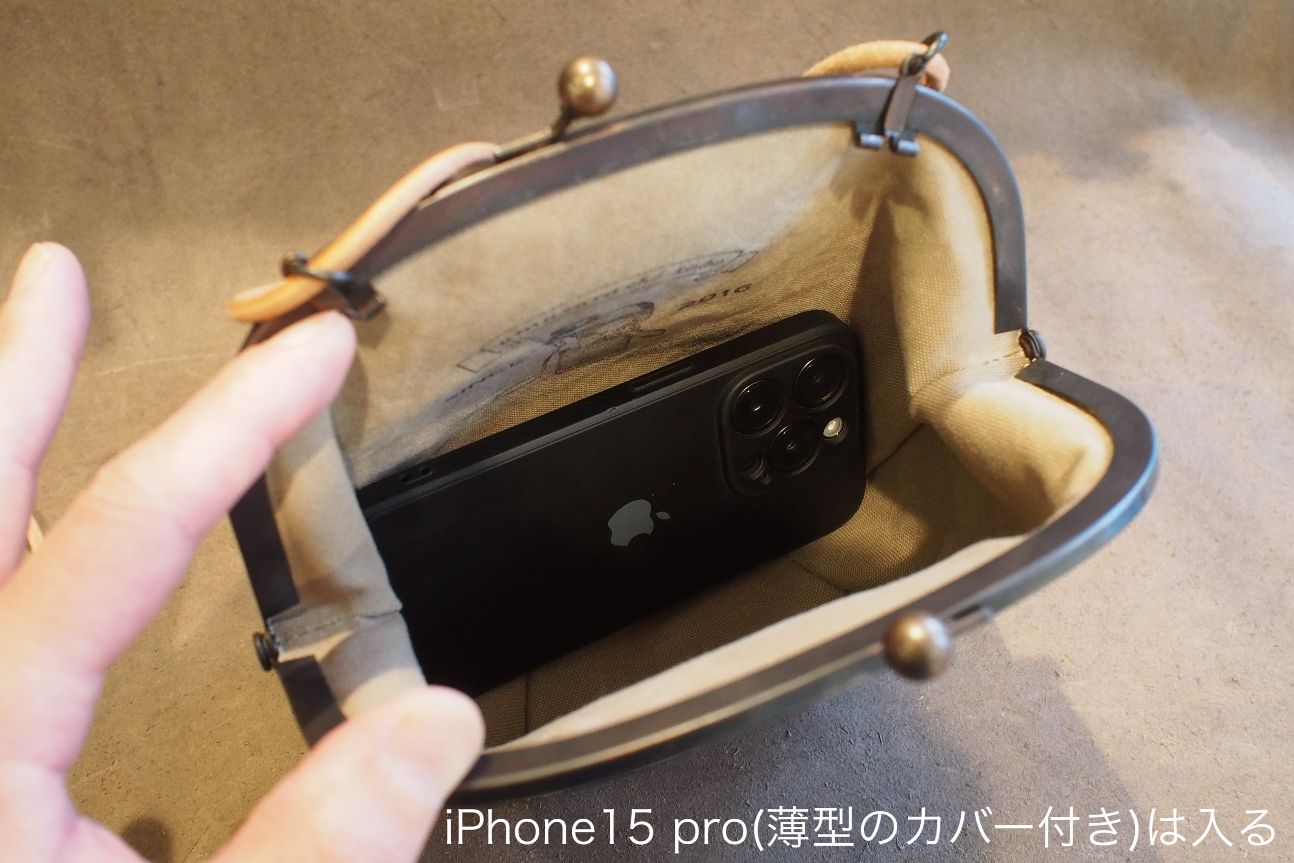 がま口の構造上、外見よりも内側が狭くなっており、スマホが入る機種と入らない機種があります。高さ150ミリ(ケース込み)の物であればギリギリ入ると思われます。