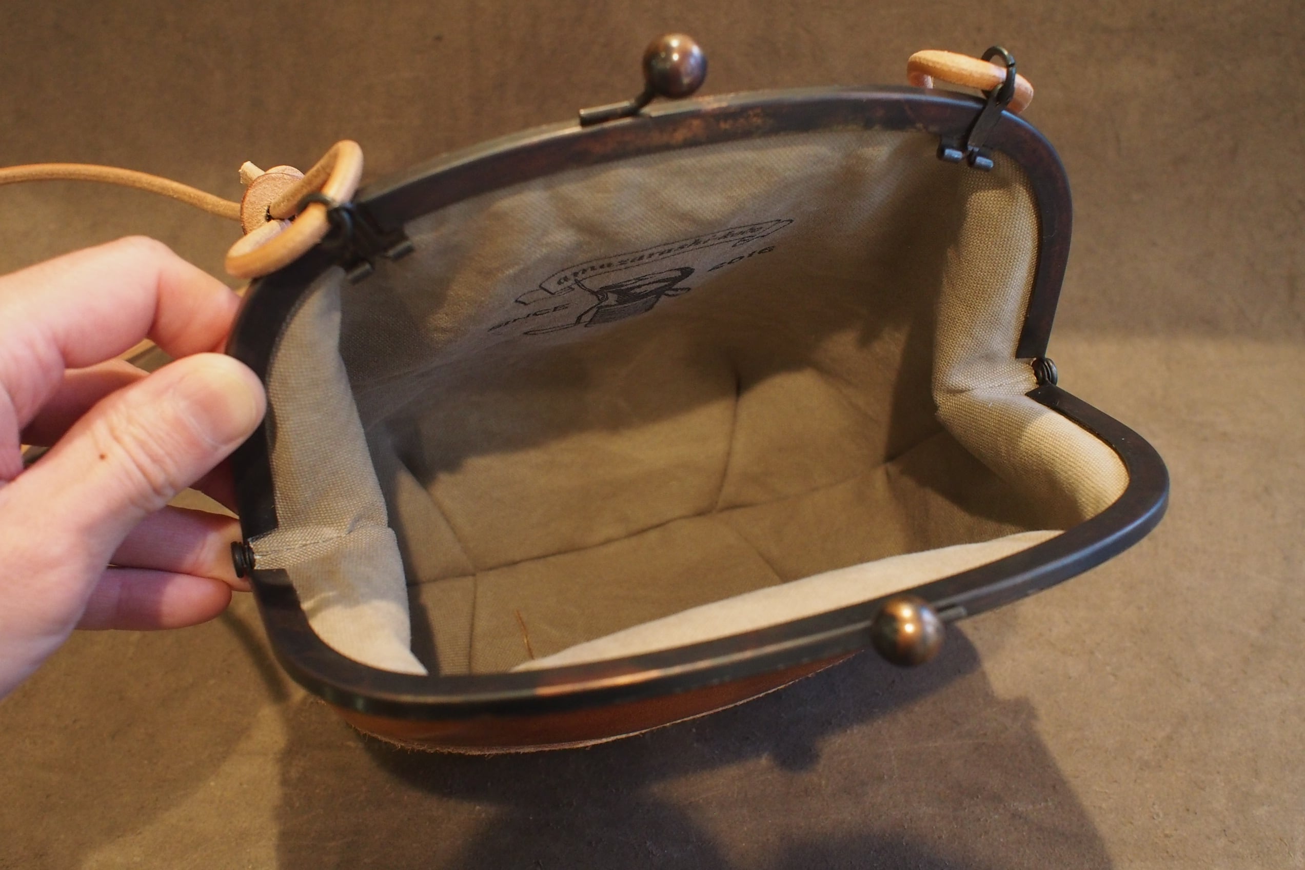口金には兼用カンが付属され、肩掛けのショルダー紐をバッグ内に仕舞う事も出来ます。